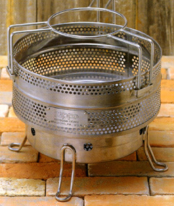綿密な計算に基づいて空けられた空気孔が、強力な火力を生み出します。炭はもちろん、薪でも両方兼用できる強力グリルは直火禁止のキャンプ場でも使用できます。 |